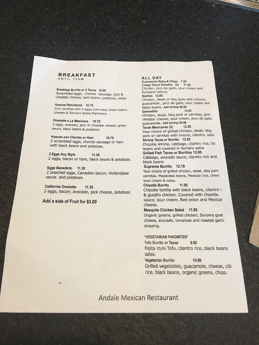 Andalé offers a straightforward and approachable menu inspired by traditional Mexican flavors, perfect for casual dining any time of day. Whether you're stopping by for a hearty breakfast burrito or settling in for flavorful tacos and bowls, the menu focuses on familiar, comforting dishes that feel both satisfying and fresh.